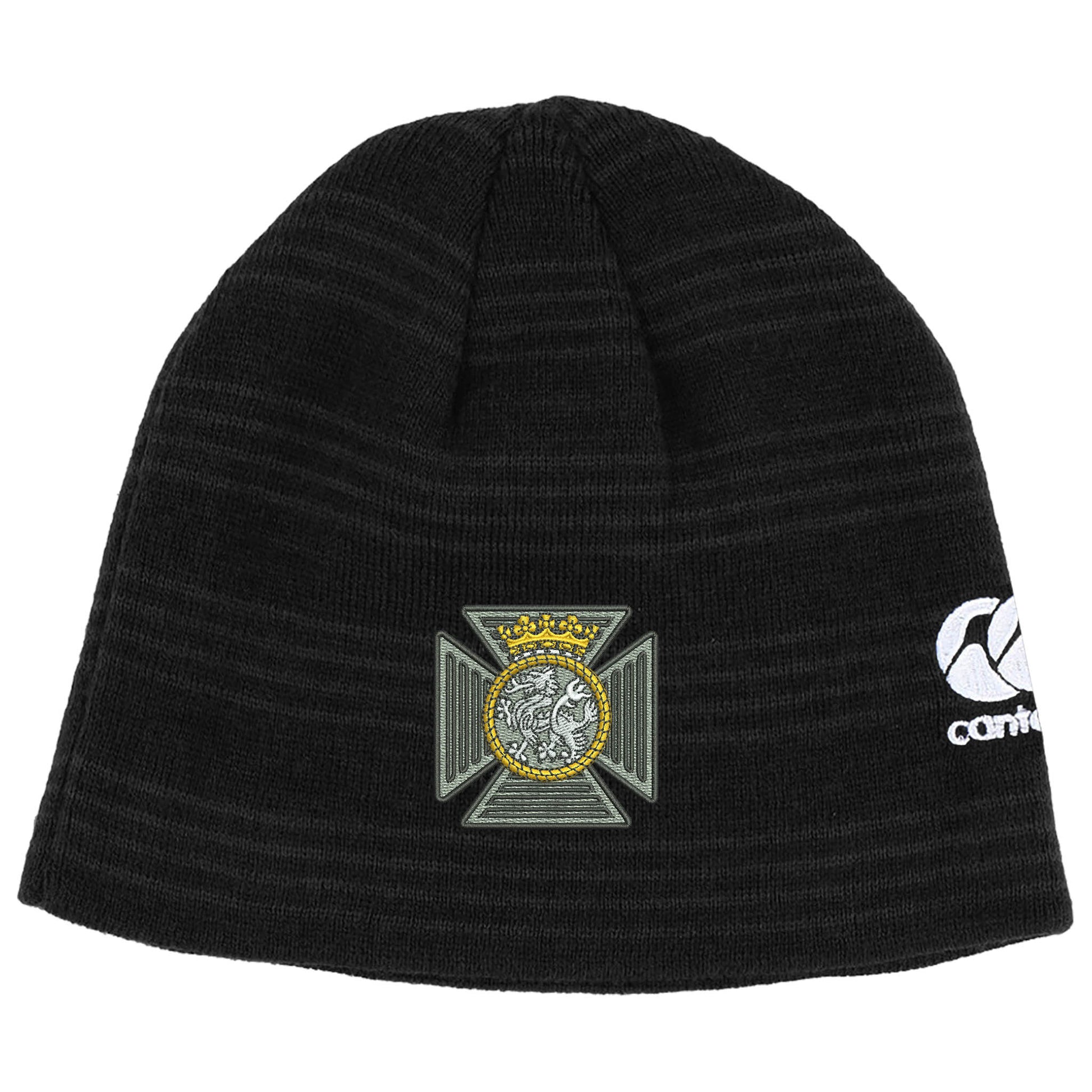 Canterbury rugby beanie headwear with regiment embroidered logo centre and Canterbury logo embroidered on left side.